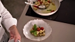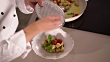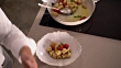4K cooking footage, detail top view woman grating nutmeg over gnocchi with tomato and basil on plate beside induction cooktop with pan