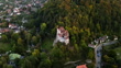 Aerial tilt up shot of bran castle in residential town, drone flying backwards over green landscape - Bran Castle seen from drone