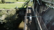 Aerial view of two gravel bikers riding through a metal footbridge on a countryside ride in Catalonia - Vídeo de stock 4K