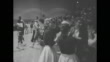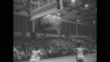 Title: "Basketball - San Francisco Wins 39th in a Row" superimposed over games between the San Francisco Dons and Fresno State College / VS San Francisco's #6 Bill Russell, Center, signing autograph / CU Russell smiling / CU Russell signing autographs / Side view crowd / Back view of Russell going down court with other members of team / San Francisco in possession of ball - player shoots for basket and misses, San Francisco recovers and attempts another - misses, Russell taps ball in for goal / WS crowd applauding / San Francisco in possession - ball is fed to Russell, Russell makes hook shot for goal / WS crowd applauding / Fresno State in possession, player shoots for basket, misses and San Francisco takes possession / Back view San Francisco going down court with ball / ball passed to Russell, he makes lay-up shot for goal / CU scoreboard Visitors 69 - Fresno 50 / players and cheerleaders on field