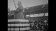 WS beauty shot EXT White House and lawn / side shot Theodore Roosevelt, wearing a black armband, speaks from platform decorated with striped bunting at event, probably campaigning; US flags hang from roof of arena in background, fluttering in breeze; spectators include US sailor and policeman / Note: exact year not known; documentation incomplete