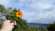 Enredadera de Susan de ojos negros sostenida de una mano en un día soleado con árboles y montañas - Vídeo de stock 4K