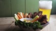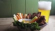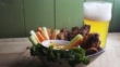 A delicious bowl o Keto hot wings served with a cup of hot sauce, carrot and celery sticks garnished with parsley, with a frosty cold beer