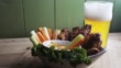 Un tazón de fuente de sanas al horno alitas de pollo a la plancha acompañados de salsa caliente apio y zanahoria palillos con una cerveza - Vídeo de stock 4K