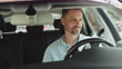 Businessman is driving a car. Front view