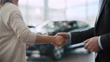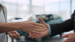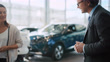 Slow motion shot of a mature car salesman shakes hands and hands over the keys of a new car to a female customer in a car showroom. Footage was taken in 8K resolution.