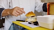 A chef stabs a wooden stick into a burger to hold it together, then hands it to his customer, out of the shot.