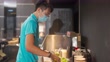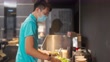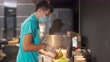 Chinese fast-food worker preparing hotdog sandwich at Concession stand in entertainment building cinema movie theater