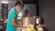 Trabajador chino de comida rápida preparando sándwich de perrito caliente en el stand de Concession en el cine de entretenimiento cinema cinema - Vídeo de stock 4K