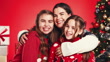 Navidad, la cara y la madre abrazan a los niños por amor, cuidado o apoyo sobre fondo rojo de estudio. Navidad, mamá y abraza a niñas, niños o hermanas felices con los padres para la celebración navideña con retrato familiar - Vídeo de stock 4K