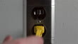 Close up hand inserting yellow plug into black outlet and pulling it out again - Vídeo de stock HD