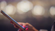 Close-up with focus on the foreground of a person's hands slowly typing on their smart phone with their screen brightly lit. City lights in Las Vegas, Nevada illuminate the scene.