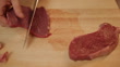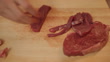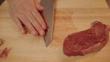 close view of hand cutting rump steak into strips on wooden chopping board