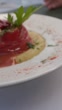 Deliciosos pimientos rellenos con carne picada y rica salsa de tomate servidos en un plato blanco - Vídeo de stock 4K