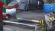 Representa a un trabajador manipulando una lámina plana de metal mientras se introduce en una máquina laminadora - Vídeo de stock 4K