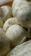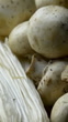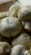 The vertical video footage features an extreme close-up view of fresh champignon and enoki mushrooms artfully arranged on a rustic wooden plate, perfect for a raw food ingredients concept. The champignon mushrooms, with their smooth, creamy caps and earthy tones, sit alongside the delicate, slender enoki mushrooms with their tiny, button-like caps and pure white stems, creating a visually striking contrast.The natural textures of the mushrooms are captured in exquisite detail—tiny ridges on the champignons’ caps and the fine, thread-like structure of the enoki stems stand out prominently. The wooden plate’s rich grain patterns and warm tones provide a rustic backdrop, emphasizing the organic and farm-fresh appeal of the ingredients.The lighting is soft and diffused, casting warm highlights and gentle shadows that enhance the mushrooms' fresh, natural appearance. Subtle movements, like a wisp of light or a soft breeze, may add life to the scene, creating a dynamic yet calming aesthetic. The blurred background keeps the focus entirely on the mushrooms, elevating their visual appeal.