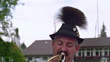 PAN from man in German costume playing trumpet to other musician / Bad Kohlgrub, Bavaria, Germany - Vídeo de stock HD