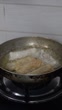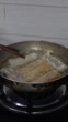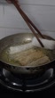 High angle view of human hands deep-frying homemade cha gio Vietnamese pork spring rolls on kitchen gas stove