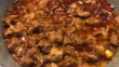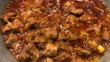 Frying pan with raw beef stroganoff on the stove