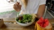 Chica comiendo ensalada de burrito fresco en un café hipster fresco. Dieta vegana en destino tropical. Una joven que tiene comida vegana en el restaurante. CÁMARA LENTA - Vídeo de stock 4K