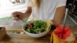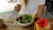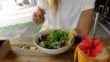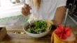Girl eating fresh burrito bowl salad in cool hipster cafe. Vegan diet in tropical destination . Young woman having vegan food in restaurant. SLOW MOTION