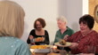 Close-up over the shoulder shot of a group of female friends enjoying a dinner party at home. They are sharing shepherd's pie, vegetables and salad.