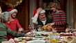 Medium panning shot of grandson putting a Christmas hat on granddad's head while the granddaughter is having a joyous talk with grandma during a Christmas dinner.