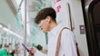 side view asian businessman is choosing songs with mobile phone and listening to music through earbuds while standing commuting at metro mrt car carriage
