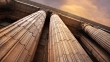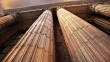 Panning shot of marble Corinthian columns from below.