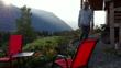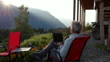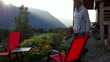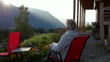 Hombre maduro se relaja junto a la casa de montaña - Vídeo de stock 4K