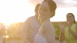 Medium close up shot of smiling bride dancing with friends on rooftop deck at sunset after wedding at tropical resort - Vídeo de stock 4K
