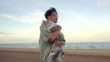 Man carry her cat travel on the beach in morning time.