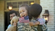 Excited mid adult mom returns home from overseas military assignment. She embraces her adorable preschool age daughter upon her return. The little girl is holding a stuffed toy dog and a small American flag. The soldier's husband is smiling in the background.