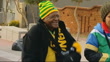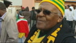SOUTH AFRICA 2010 WORLD CUP: Opening ceremony / Day 1 matches; Soweto:EXTArchbishop Desmond Tutu along street (wearing South Africa hat and scarf) South Africa football fans dancing and singing in streetArchbishop Desmond Tutu interview SOT- (speaking about death of Zenani Mandela) our hearts go out to the family/ almost like saying you have been a sacrifice for the country