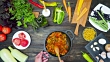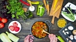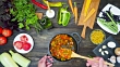 Preparing vegan minestrone with green beans and fresh herbs. Mixing chopped vegetables in the frying pan. Overhead view