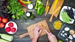 Preparing vegan minestrone with green beans and fresh herbs. Chopping a carrot. Overhead view