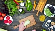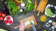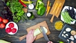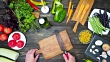 Preparing vegan minestrone with green beans and fresh herbs. Chopping a squash. Overhead view