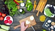 Preparing vegan minestrone with green beans and fresh herbs. Chopping a squash. Overhead view