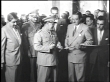 1953 MONTAGE President Marcos Perez Jimenez in military uniform dedicating a nutrition building, children line up applauding, and Jimenez cutting ribbon to the Ministry of the Interior building that the oil industry has help build / Caracas, Venezuela
