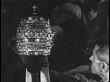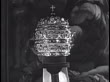 1940: VATICAN CITY: VESTMENTS: Priests carry Papal Tiara & robes into room & to alter. VS Papal Tiara. Laying out vestment clothing, the Papal Cope.