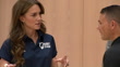 Various of Catherine, Princess of Wales along into University of Hull sports hall speaking with Tom Coyd (Head Coach, England Wheelchair Rugby League) (red and blue jacket) others follow (not heard)