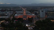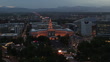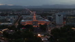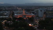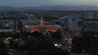 Aerial view of a large crowd gathered at the City and County Building in downtown Denver, Colorado during twilight. The neoclassical government building is dramatically illuminated in amber lighting, highlighting its distinctive dome and symmetrical architecture. The Rocky Mountains form a silhouette along the horizon while city lights stretch across the urban landscape. Modern office buildings and residential developments surround the civic center area. The video features subtle panning camera movement that showcases the scale of the gathering and the relationship between the illuminated landmark and the surrounding cityscape.