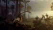 A Quetzalcoatlus roams through a forest in a computer generated animation.