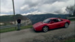 A red Ferrari Testarossa stops on a curvy mountain road near a man sitting on a guard rail.