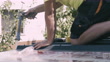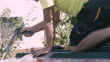 Roofer using glue gun with silicone adhesive or manual caulking gun with polyurethane to seal roof tile on the roof. Installing and building construction concept.