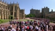 General view of St George's Chapel, Lower Ward / schoolchildren sitting on grass / high angle view of crowd of people along Long Walk / Lower Ward / various shots of crowds of people - some waving Union flags / high angle view of St George's Chapel / crowds of people - some with Union Jack flags / Long Walk