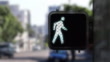 Medium shot of pedestrian walk signal with traffic in the background, as it transitions from walk signal, counting down from 9 seconds to a Don't Walk warning