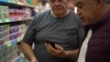 Hombres mayores comprando algunos productos en el supermercado mientras usan el teléfono inteligente - Vídeo de stock HD