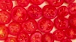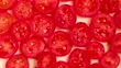 Sliced red cherry tomatoes rotating on wooden serving table. Full frame. Top view. Flat lay. Close up. Selective soft focus. Shallow depth of field. Text copy space.
