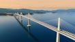 Slow motion aerial view of Peljeski bridge passing over Adriatic seascape leading towards mountain against sky during sunset in Croatia